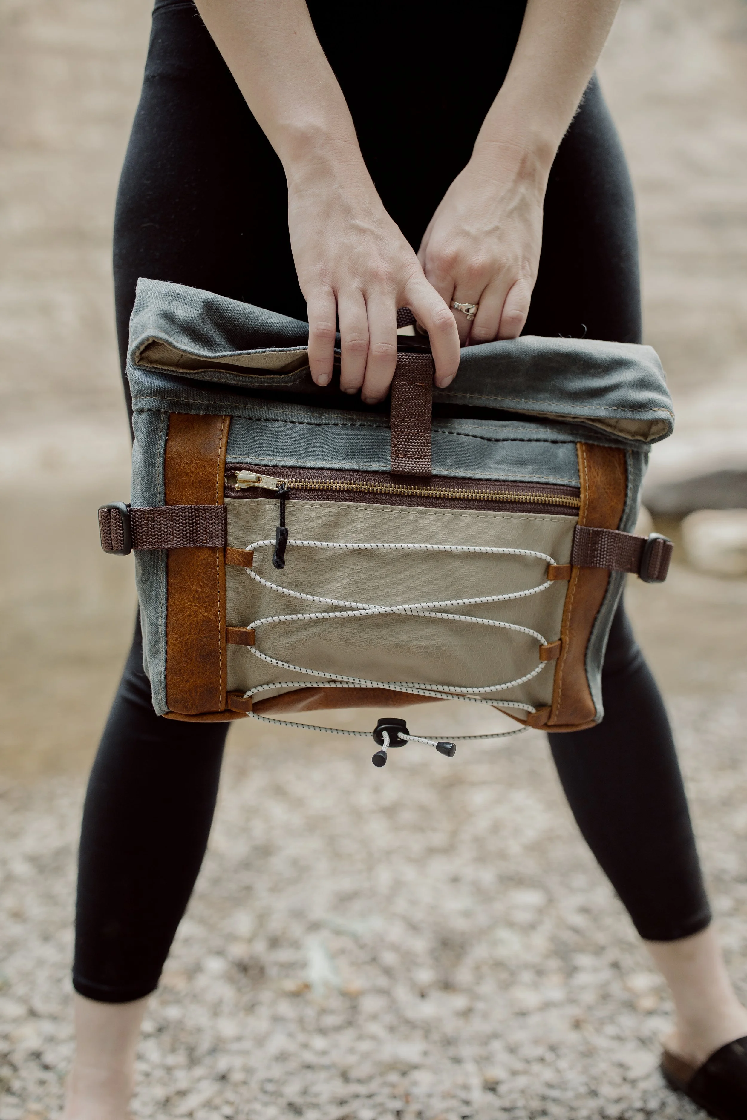 The Denver Roll Top has it all; ample space and storage, ultimate comfort and multiple carrying options. This bag, made from waxed canvas, leather and waterproof ripstop, features cushioned hip flaps to wear around your waist or across your chest/back. It comes with a detachable, adjustable wide webbing strap to wear the bag crossbody or over the shoulder. The large front zipper pocket features shock cording to carry any additional items, like a layering shirt for hiking or a pair of gloves. Attach a carabiner to the cording and bring along doggie bags on your walk.